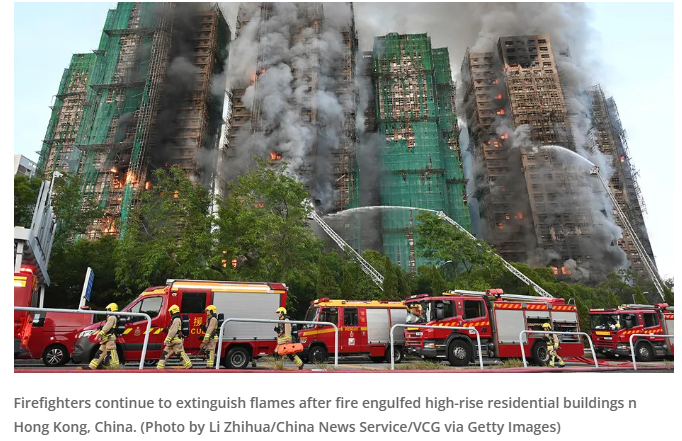 • A deadly fire swept through seven high-rise buildings in Hong Kong, killing at least 44 people and leaving 279 missing.